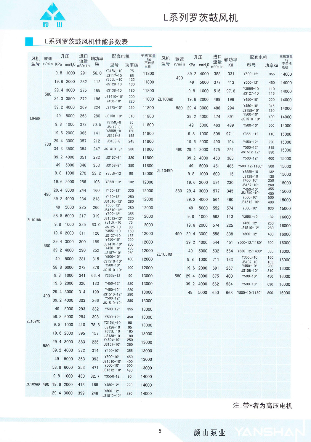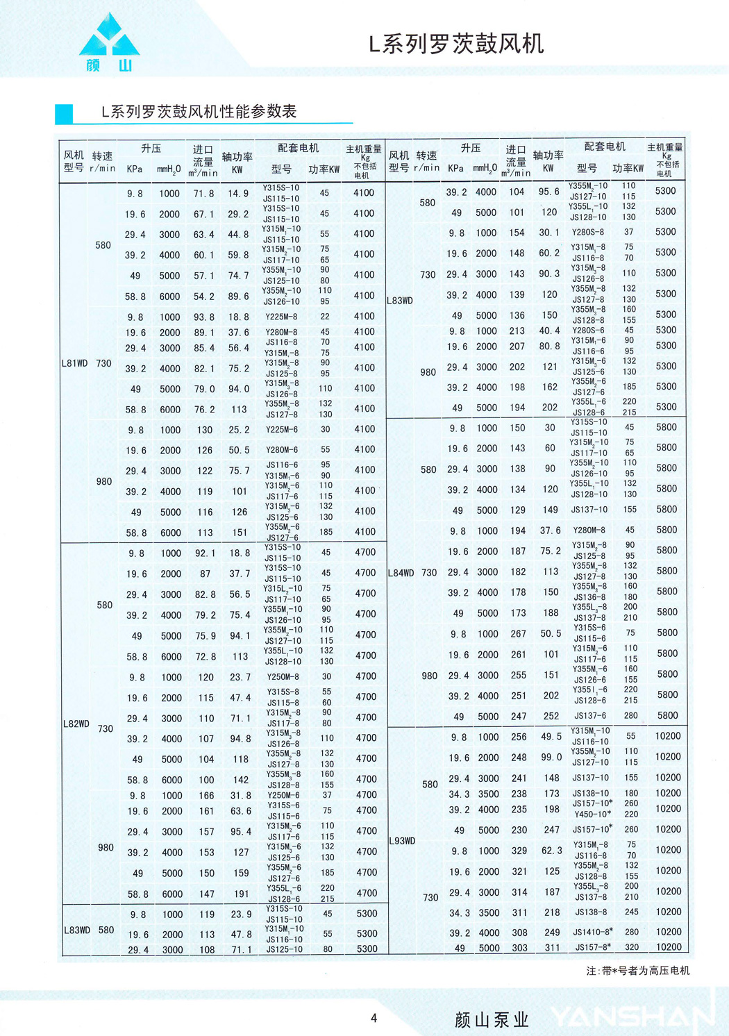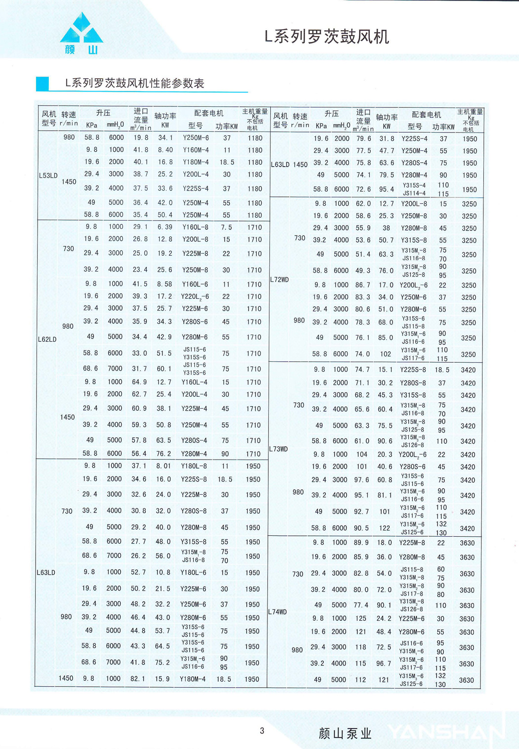 L系列羅茨鼓風(fēng)機的流量范圍為1.46立方米/分—711立方米/分,升壓范圍9.8Kpa-68.6Kpa.